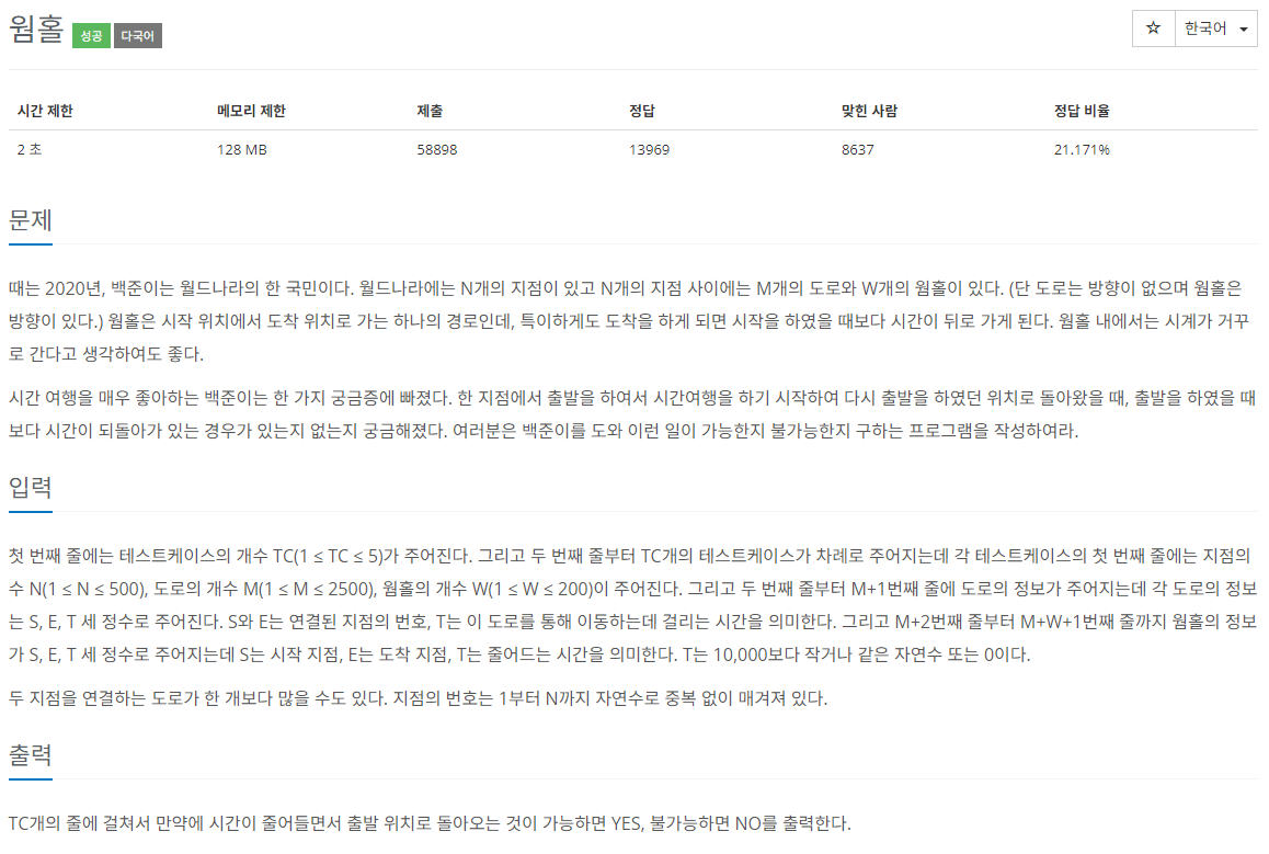 도로를 양방향 양수 가중치 간선으로, 웜홀을 단방향 음수 가중치 간선으로 치환하면, 그래프에서 음수 사이클이 존재 여부를 확인하는 문제이다.