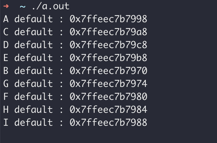 I의 밑에 가상 상속된 원시 클래스들이 할당되는데, 그 위치가 특이하다. A, C는 생성자 호출 순서대로 쭉 쌓였지만, E와 D는 예상과 달리 뒤바뀌어 있다. 분명히 D의 생성자가 먼저 호출되었음에도 E의 주소가 더 낮다....