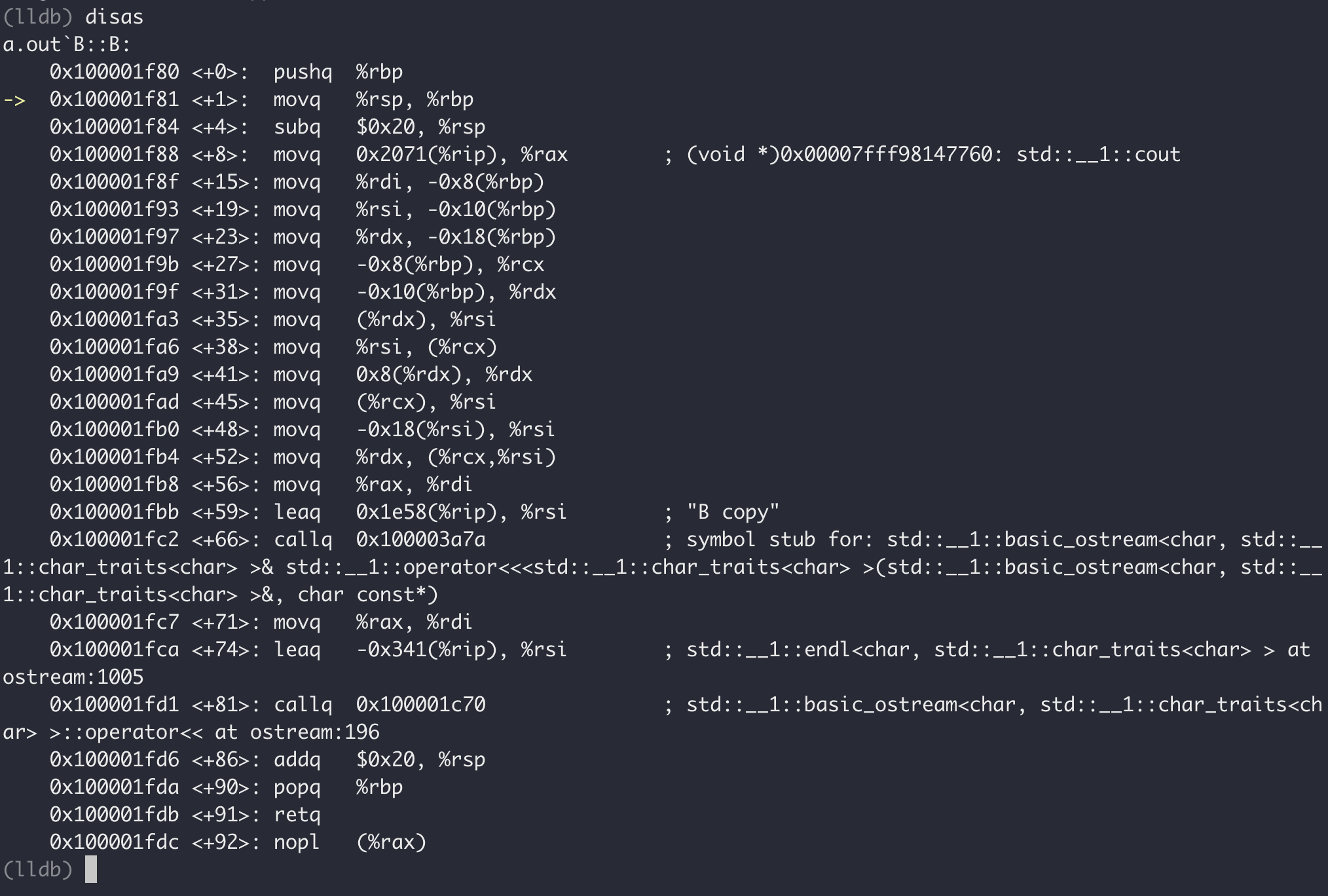 어셈블리 코드를 통해 직접 확인할 수 있다. 컴파일 시 D의 생성자에서 A의 생성자를 호출하도록 하며, B와 C의 생성자에서는 A의 생성자를 호출하는 명령어를 찾을 수 없다.