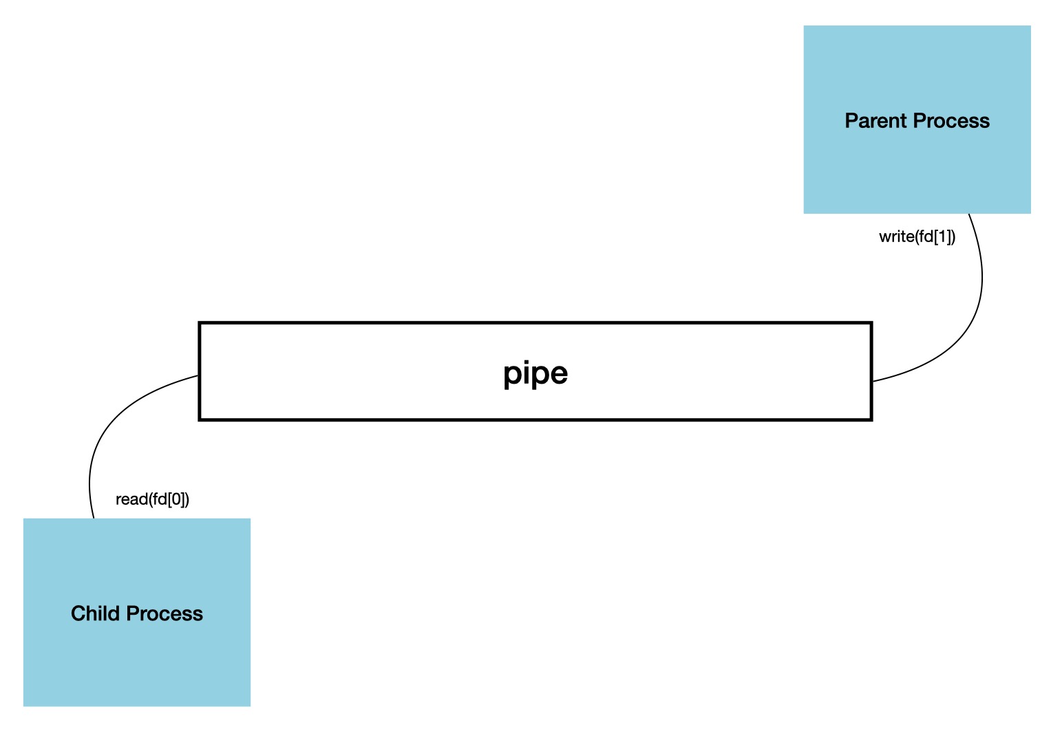 pipe는 커널 메모리를 파일로써 접근할 수 있게 해주어, pipe() 사용시 배열로 두 개의 file descriptor를 발급받는다. fd[0]은 input stream, fd[1]은 output stream으로, 부모 프로세스가 fd[1]에 write한 데이터를 자식 프로세스가 fd[0]으로 read 할 수 있다. 이때 반대의 경우는 사용이 불가능하다. 부모 프로세스가 write, 자식 프로세스가 read하는 상황에서 그 pipe를 유지한 채 자식프로세스가 fd[1]에 write할 수 없다.